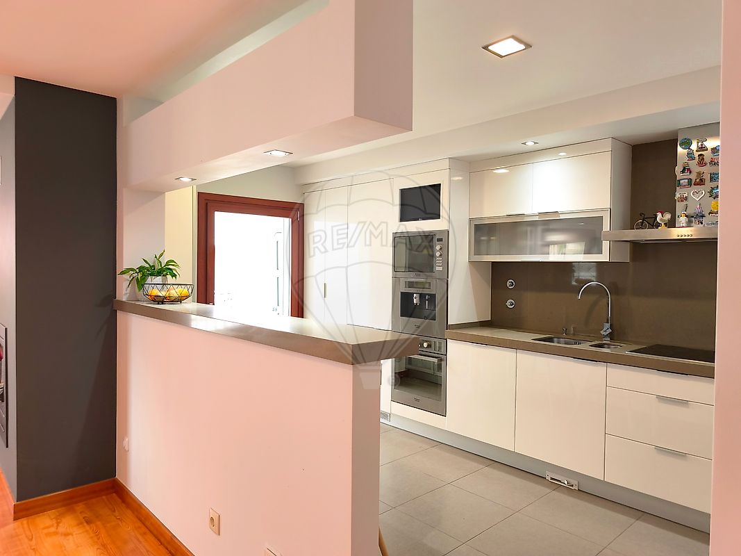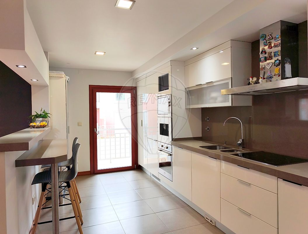 • Totalmente equipada com eletrodomésticos encastrados (máquina de café, forno elétrico, micro-ondas, máquina de lavar loiça, máquina de lavar roupa e frigorífico), placa de vitrocerâmica, extrator, esquentador a gás para apoio aos painéis de aquecimento de águas sanitárias