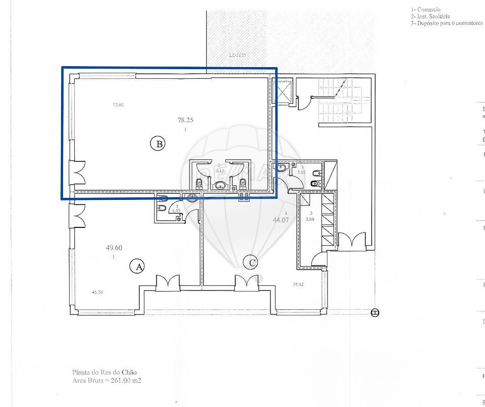 Loja ampla em forma retangular com um WC e arrecadação.