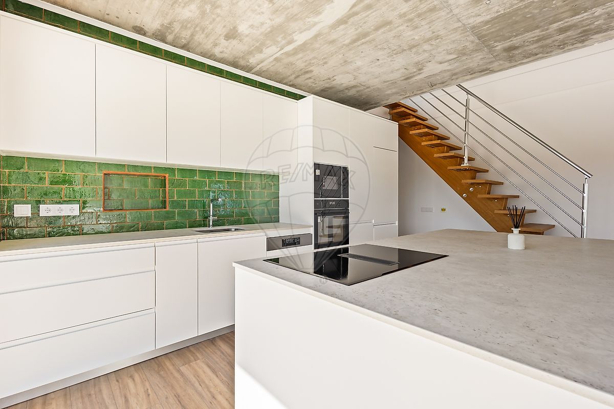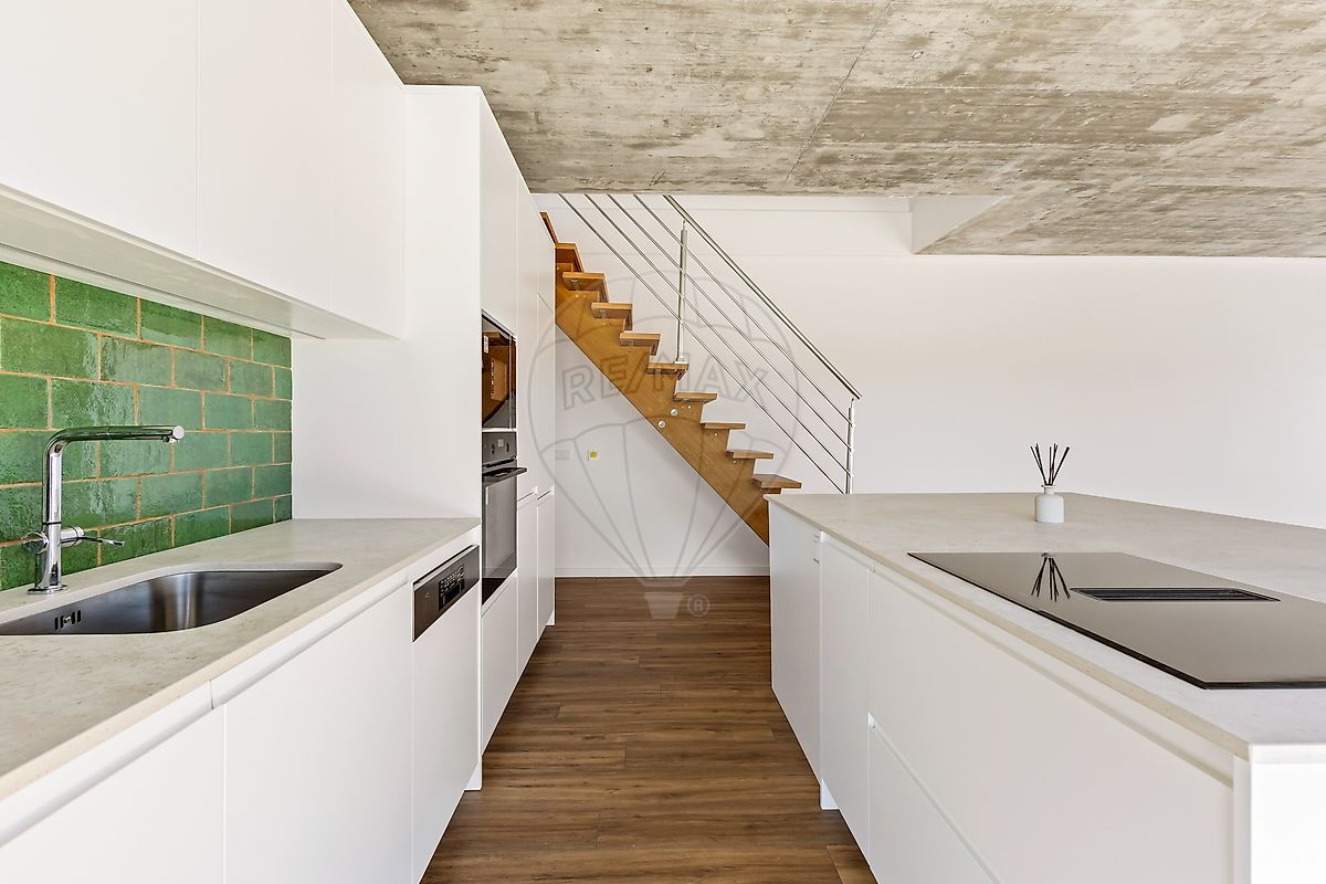 A cozinha, à medida, totalmente equipada e com ilha, conta com eletrodomésticos de alta qualidade AEG. Aqui, desenvolve-se o coração da casa e o epicentro do design e lazer onde a cozinha abraça a sala em open space com charme combinando na perfeição a tradição dos azulejos de produção manual e artesanal com o design contemporâneo.